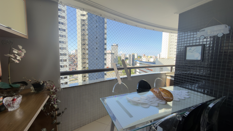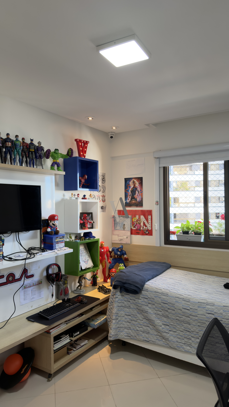 Apartamento de três quartos, suíte, varanda, cozinha americana, salas em dois ambientes, piso em porcelanato, banheiro social, área e banheiro de serviço, projeto de iluminação e gesso. Dependência revertida para ampliar a sala, duas vagas, 102m2